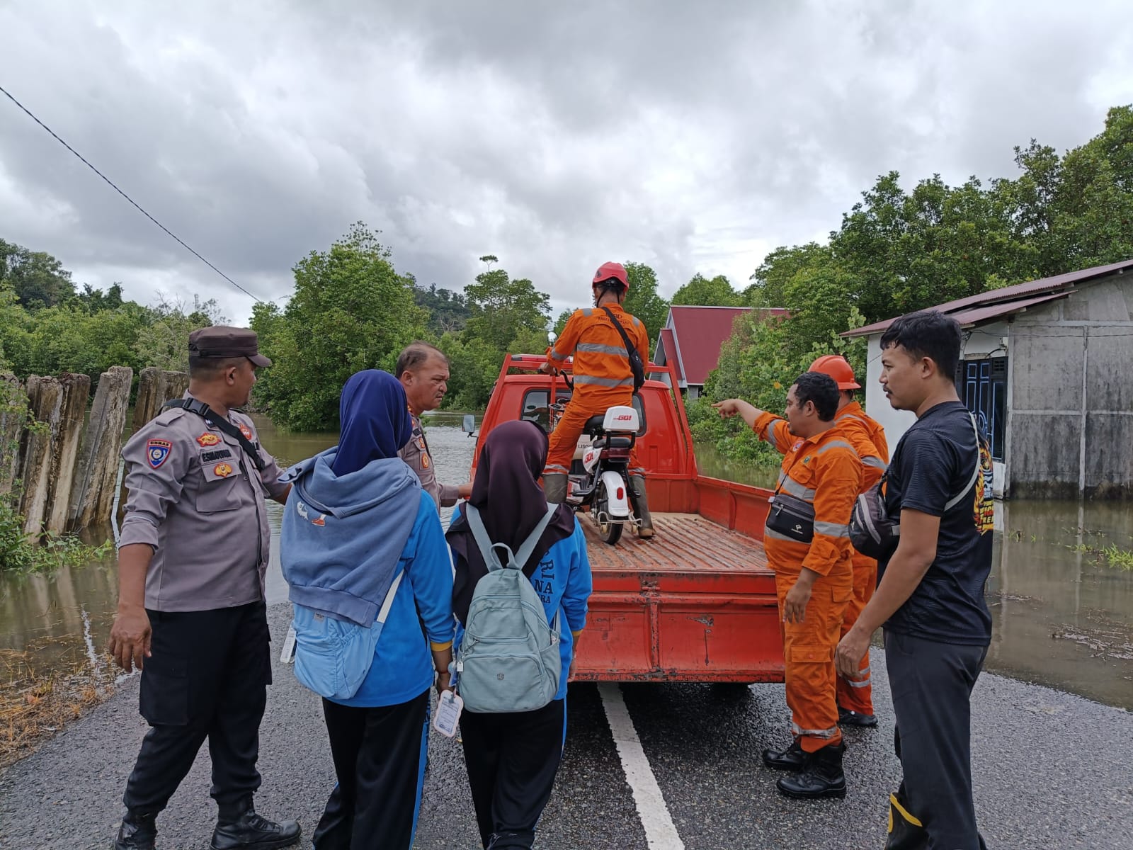 Pada dokumentasi di lokasi, tampak personel kepolisian dan petugas berseragam oranye—diduga tim SAR—membantu warga, termasuk menaikkan sepeda motor ke bak kendaraan untuk membantu mereka melintasi jalan yang terendam banjir.